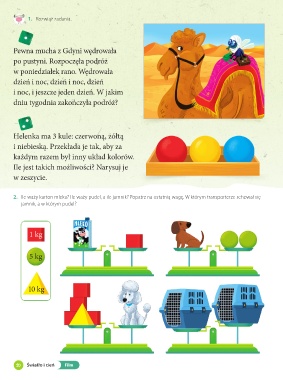 2. Ile waży karton mleka? Ile waży pudel, a ile jamnik? Popatrz na ostatnią wagę. W którym transporterze schował się