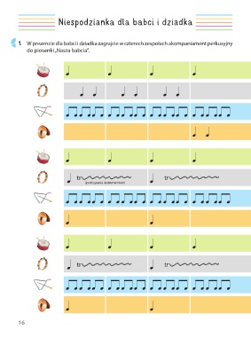 Niespodzianka dla babci i dziadka 1. W prezencie dla babci i dziadka zagrajcie w czterech zespołach akompaniament perkusyjny do piosenki „Nasza babcia”. tr tr (potrząsanie instrumentem) tr tr 16