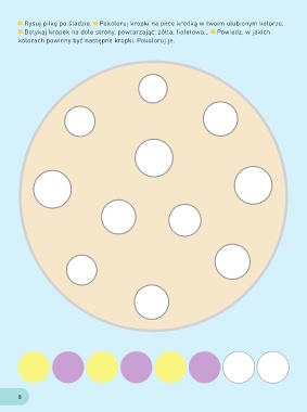 Rysuj piłkę po śladzie. Pokoloruj kropki na piłce kredką w twoim ulubionym kolorze. Dotykaj kropek na dole strony, powtarzając: żółta, fioletowa... Powiedz, w jakich kolorach powinny być następne kropki. Pokoloruj je. 8