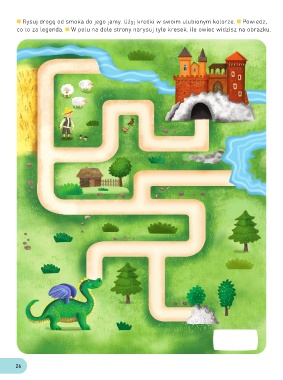 Rysuj drogę od smoka do jego jamy. Użyj kredki w swoim ulubionym kolorze. Powiedz, co to za legenda. W polu na dole strony narysuj tyle kresek, ile owiec widzisz na obrazku. 26