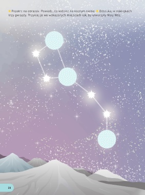 Popatrz na obrazek. Powiedz, co widzisz na nocnym niebie. Odszukaj w naklejkach trzy gwiazdy. Przyklej je we wskazanych miejscach tak, by utworzyły Mały Wóz. 28
