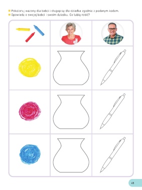Pokoloruj wazony dla babci i długopisy dla dziadka zgodnie z podanym kodem. Opowiedz o swojej babci i swoim dziadku. Co lubią robić? 45