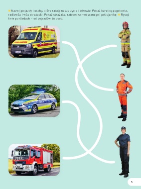 Nazwij pojazdy i osoby, które ratują nasze życie i zdrowie. Pokaż karetkę pogotowia, radiowóz i wóz strażacki. Pokaż strażaka, ratownika medycznego i policjantkę. Rysuj linie po śladach – od pojazdów do osób. 5
