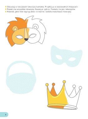 Odszukaj w naklejkach rekwizyty teatralne. Przyklej je w odpowiednich miejscach. Popatrz na wszystkie rekwizyty. Nazwij je i policz. Powiedz, ile jest rekwizytów. Powiedz, jakie role zagrają dzieci w teatrze. Dokończ kolorować rekwizyty. 8