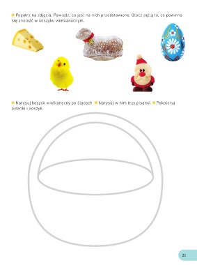 Popatrz na zdjęcia. Powiedz, co jest na nich przedstawione. Otocz pętlą to, co powinno się znaleźć w koszyku wielkanocnym. Narysuj koszyk wielkanocny po śladach. Narysuj w nim trzy pisanki. Pokoloruj pisanki i koszyk. 21