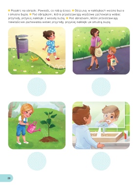 przyrody, przyklej naklejki z wesołą buzią. Pod obrazkami, które przedstawiają