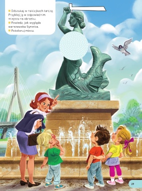 Odszukaj w naklejkach tarczę. Przyklej ją w odpowiednim miejscu na obrazku. Powiedz, jak wygląda warszawska Syrenka. Pokoloruj miecz. 29