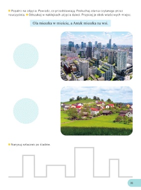 Popatrz na zdjęcia. Powiedz, co przedstawiają. Posłuchaj zdania czytanego przez nauczyciela. Odszukaj w naklejkach zdjęcia dzieci. Przyklej je obok właściwych miejsc. Ola mieszka w mieście, a Antek mieszka na wsi. Narysuj szlaczek po śladzie. 31