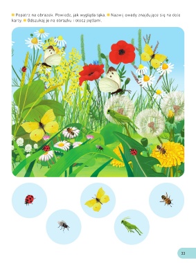 Popatrz na obrazek. Powiedz, jak wygląda łąka. Nazwij owady znajdujące się na dole karty. Odszukaj je na obrazku i otocz pętlami. 33