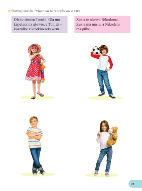 Słuchaj tekstów. Połącz każde rodzeństwo w pary. Ola to siostra Tomka. Ola ma Zuzia to siostra Nikodema. kapelusz na głowie, a Tomek – Zuzia ma misia, a Nikodem koszulkę z krótkim rękawem. ma piłkę. 39