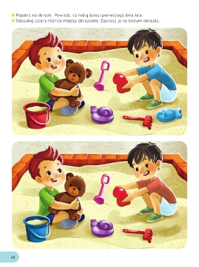 Popatrz na obrazki. Powiedz, co robią dzieci pierwszego dnia lata. Odszukaj cztery różnice między obrazkami. Zaznacz je na dolnym obrazku. 42