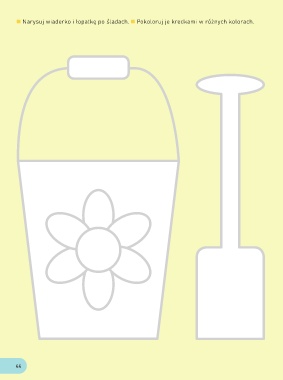 Narysuj wiaderko i łopatkę po śladach. Pokoloruj je kredkami w różnych kolorach. 44