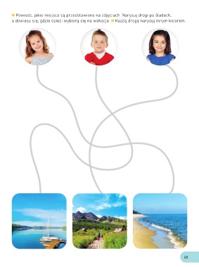Powiedz, jakie miejsca są przedstawione na zdjęciach. Narysuj drogi po śladach, a dowiesz się, gdzie dzieci wybiorą się na wakacje. Każdą drogę narysuj innym kolorem. 45