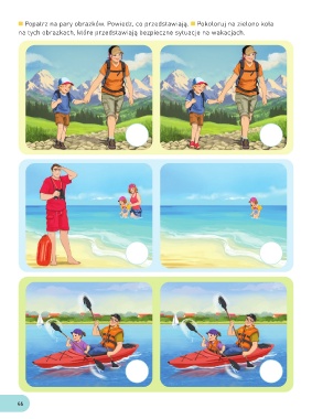 Popatrz na pary obrazków. Powiedz, co przedstawiają. Pokoloruj na zielono koła na tych obrazkach, które przedstawiają bezpieczne sytuacje na wakacjach. 46