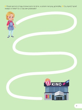 Pokaż palcem drogę dziewczynki do kina, a potem narysuj ją kredką. Czy byłeś/ byłaś kiedyś w kinie? Co ci się tam podobało? 7