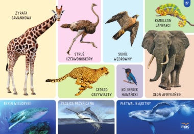 27 ŻYRAFA SAWANNOWA KAMELEON LAMPARCI STRUŚ SOKÓŁ CZERWONOSKÓRY WĘDROWNY GEPARD KOLIBEREK GRZYWIASTY HAWAŃSKI SŁOŃ AFRYKAŃSKI REKIN WIELORYBI ŻAGLICA PACYFICZNA PŁETWAL BŁĘKITNY