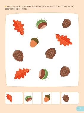 Policz osobno liście, kasztany, żołędzie i szyszki. W polach na dole strony narysuj odpowiednią liczbę kropek. 11