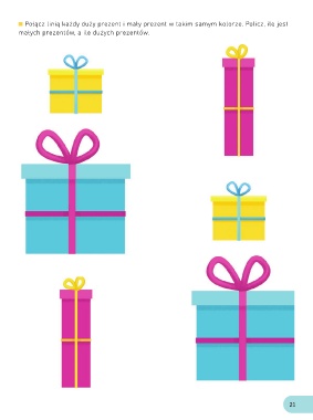 Połącz linią każdy duży prezent i mały prezent w takim samym kolorze. Policz, ile jest małych prezentów, a ile dużych prezentów. 21