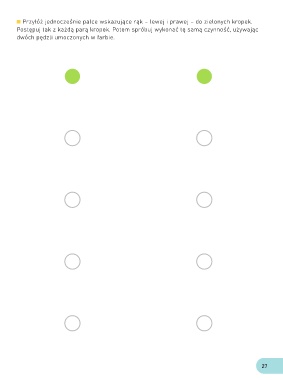 Przyłóż jednocześnie palce wskazujące rąk – lewej i prawej – do zielonych kropek. Postępuj tak z każdą parą kropek. Potem spróbuj wykonać tę samą czynność, używając dwóch pędzli umoczonych w farbie. 27