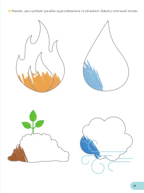 Powiedz, jakie symbole żywiołów są przedstawione na obrazkach. Dokończ kolorować obrazki. 39
