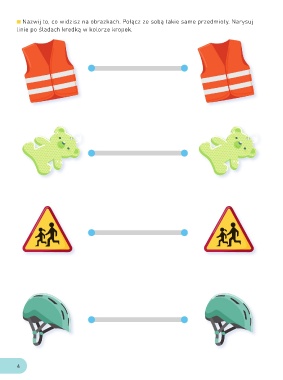 Nazwij to, co widzisz na obrazkach. Połącz ze sobą takie same przedmioty. Narysuj linie po śladach kredką w kolorze kropek. 4