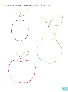 Połącz kropki kredkami w odpowiednich kolorach. Pokoloruj rysunki. 9
