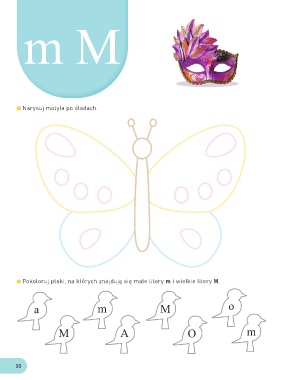 m M Narysuj motyla po śladach. Pokoloruj ptaki, na których znajdują się małe litery m i wielkie litery M. a m M o M A O m 10