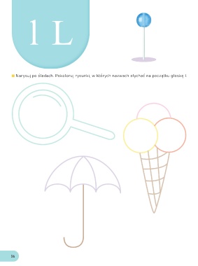 l L Narysuj po śladach. Pokoloruj rysunki, w których nazwach słychać na początku głoskę l. 16