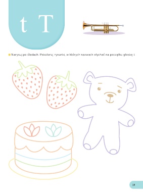 t T Narysuj po śladach. Pokoloruj rysunki, w których nazwach słychać na początku głoskę t. 19
