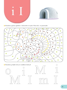 i I Pokoloruj pola zgodnie z kolorami kropek. Powiedz, co powstało. o i M i Pokoloruj małe litery i i wielkie litery I. M I m I 21