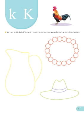 k K Narysuj po śladach. Pokoloruj rysunki, w których nazwach słychać na początku głoskę k. 27
