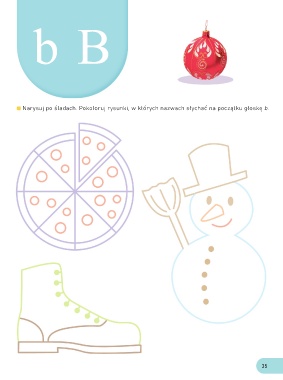 b B Narysuj po śladach. Pokoloruj rysunki, w których nazwach słychać na początku głoskę b. 35