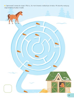 Zaprowadź konia do stajni. Policz, ile marchewek znalazł po drodze. W okienku narysuj odpowiednią liczbę kropek. 37