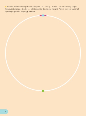 Przyłóż jednocześnie palce wskazujące rąk – lewej i prawej – do niebieskiej kropki. Narysuj oburącz po śladach – od niebieskiej do zielonej kropki. Potem spróbuj wykonać tę samą czynność, używając kredek. 4