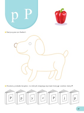 p P Narysuj psa po śladach. Pokoloruj okładki książek, na których znajdują się małe litery p i wielkie litery P. P p y r P j p 49