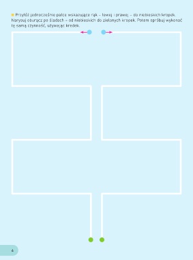 Przyłóż jednocześnie palce wskazujące rąk – lewej i prawej – do niebieskich kropek. Narysuj oburącz po śladach – od niebieskich do zielonych kropek. Potem spróbuj wykonać tę samą czynność, używając kredek. 6
