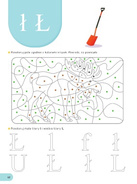 ł Ł Pokoloruj pola zgodnie z kolorami kropek. Powiedz, co powstało. Ł l f ł Pokoloruj małe litery ł i wielkie litery Ł. U Ł ł L 62