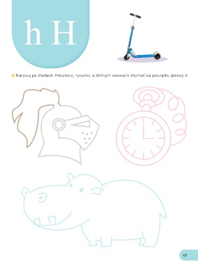 h H Narysuj po śladach. Pokoloruj rysunki, w których nazwach słychać na początku głoskę h. 67