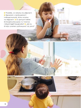 Powiedz, co widzisz na zdjęciach. Opowiedz o zachowaniach niebezpiecznych, które widzisz na zdjęciach. Co jest potrzebne do bezpiecznej jazdy na rowerze, rolkach bądź hulajnodze? Jak na drodze powinni zachowywać się piesi? 10