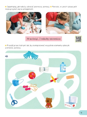 Zapamiętaj, jak należy udzielać pierwszej pomocy. Powiedz, w jakich sytuacjach może przydać się ta umiejętność. 30 uciśnięć, 2 wdechy ratownicze Przejdź przez labirynt tak, by skompletować wszystkie elementy apteczki pierwszej pomocy. 13