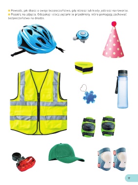 Powiedz, jak dbasz o swoje bezpieczeństwo, gdy idziesz lub kiedy jedziesz na rowerze. Popatrz na zdjęcia. Odszukaj i otocz pętlami te przedmioty, które pomagają zachować bezpieczeństwo na drodze. 17