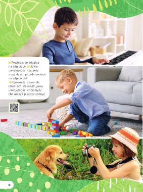 Powiedz, co widzisz na zdjęciach. Jakie umiejętności i talenty mają dzieci przedstawione na zdjęciach? Opowiedz o swoich talentach. Powiedz, jakie umiejętności chciałbyś/ chciałabyś jeszcze zdobyć. 18