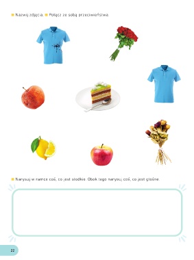 Nazwij zdjęcia. Połącz ze sobą przeciwieństwa. Narysuj w ramce coś, co jest słodkie. Obok tego narysuj coś, co jest głośne. 22