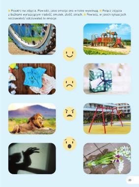 Popatrz na zdjęcia. Powiedz, jakie emocje one w tobie wywołują. Połącz zdjęcia z buźkami wyrażającymi radość, smutek, złość, strach. Powiedz, w jakich sytuacjach odczuwałeś/ odczuwałaś te emocje. 23