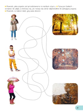 Powiedz, jaka pogoda jest przedstawiona na każdym zdjęciu. Rysuj po śladach – od dzieci do zdjęć, a dowiesz się, jak należy się ubrać odpowiednio do panującej pogody. Powiedz, co lubisz robić, gdy pada deszcz. 29