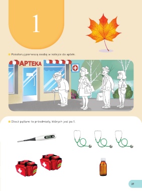 1 Pokoloruj pierwszą osobę w kolejce do apteki. Otocz pętlami te przedmioty, których jest po 1. 37