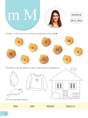 m M ma ma mama Połącz w pary orzechy, na których znajdują się litery m, M. A a M m O a M o m o Pokoloruj rysunki, których nazwy rozpoczynają się głoską m. Przeczytaj lub posłuchaj. ma am mam mama 44