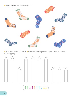 Połącz w pary takie same skarpetki. Rysuj duże kredki po śladach. Pokoloruj kredki zgodnie z kodem. Czy każda kredka ma swoją parę? 46
