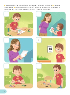 Popatrz na obrazki. Zastanów się, o jakim dniu opowiada ta historia. Opowiedz o swojej pani. Zaznacz kolejność zdarzeń, rysując w okienkach przy obrazkach odpowiednią liczbę kropek. Pierwszy obrazek został już oznaczony. 48