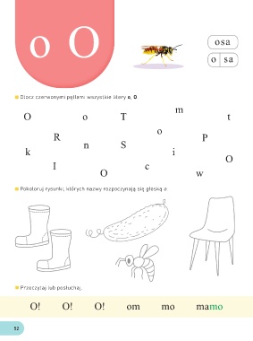 o O o sa osa Otocz czerwonymi pętlami wszystkie litery o, O. m O o T t o R P k n S i O I c O w Pokoloruj rysunki, których nazwy rozpoczynają się głoską o. Przeczytaj lub posłuchaj. O! O! O! om mo mamo 52